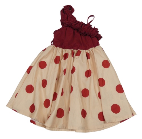 Vínovo-růžové asymetrické šaty s puntíky a volány