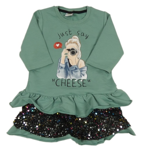Zelené teplákové šaty s dívkou a volánky s flitry