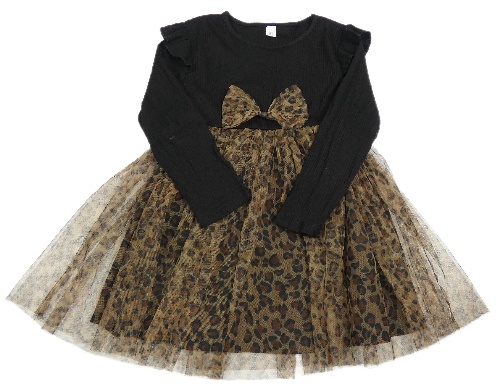 Černo-hnědé žebrované vzorované bavlněno/tylové šaty s mašlí a volánky