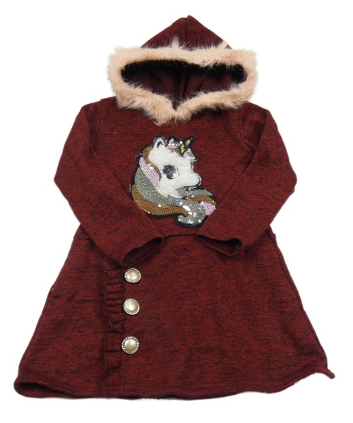 Bordó-černé melírované pletené šaty s jednorožcem a kapucí