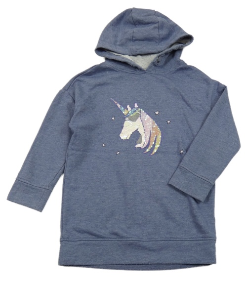 Tmavomodré melírované teplákové šaty s jednorožcem z překlápěcích flitrů a kapucí Next