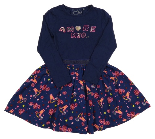Tmavomodré bavlněné šaty s nápisem a květovanou sukní
