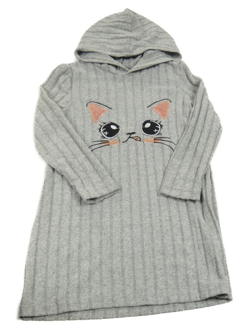 Šedé úpletové žebrované šaty s kočkou a kapucí