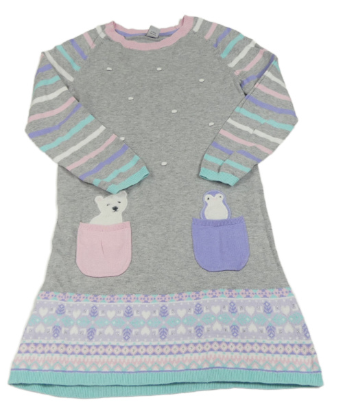 Šedo-barevné svetrové šaty s pruny na rukávech a zvířaty Tu