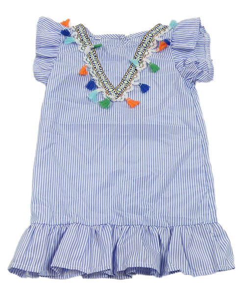 Modro-bílé pruhované šaty se střapci a volánky