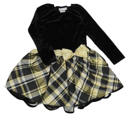 Černo-bílo-zlaté sametové šaty s mašlí a kostkovanou sukní