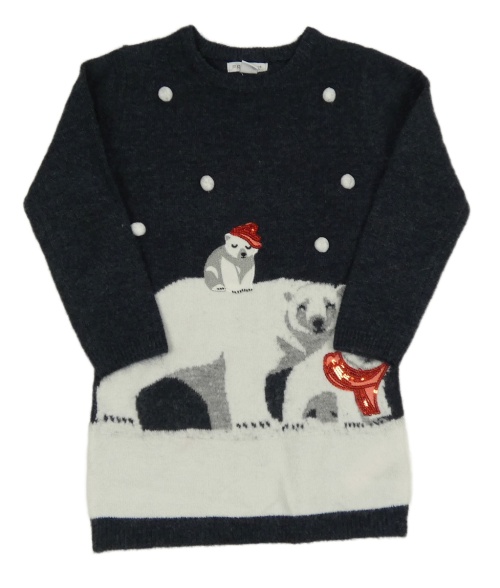 Tmavomodro-bílé melírované svetrové šaty s ledními medvídky s flitry a bambulkami PRIMARK