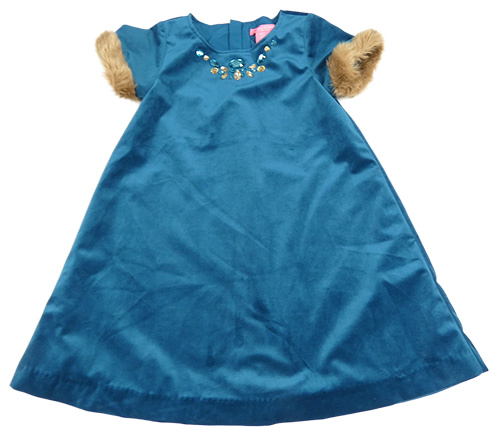 Petrolejové sametové šaty s kamínky a kožešinou