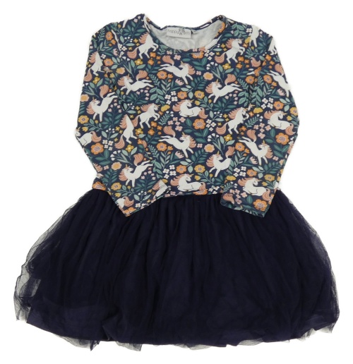 Tmavomodro-zelené vzorované šaty s jednorožci a tylovou sukní