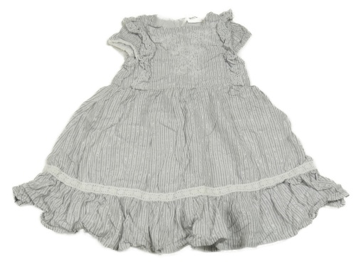 Šedo-bílé pruhované třpytivé plátěné šaty s výšivkou a volánky s madeirou Topolino