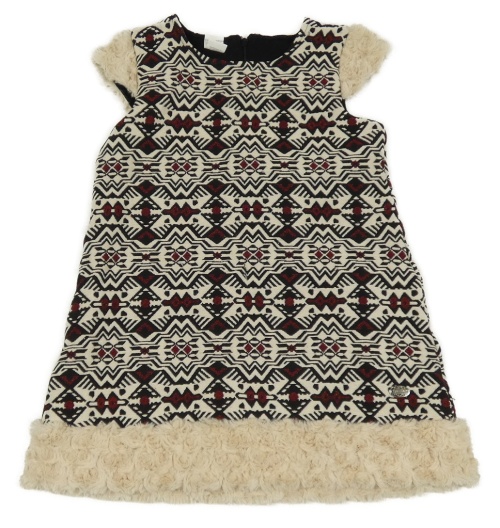 Smetanovo-černo-vínové vzorované šaty s kožešinovými lemy