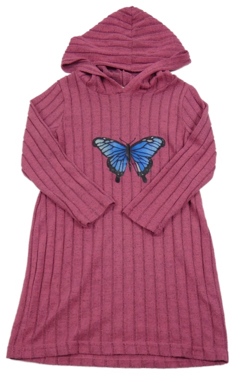 Růžovo-šedé melírované žebrované svetrové šaty s motýlem a kapucí