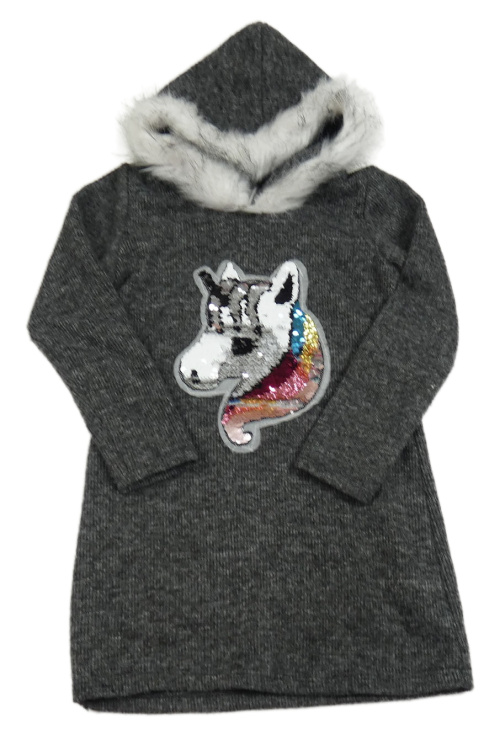 Tmavošedé melírované pletené šaty s jednorožcem a kapucí