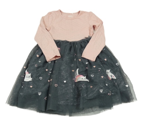 Světlerůžovo-tmavošedé šaty s puntíky a tylem a kočičkami a duhami Topolino
