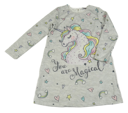 Světlešedé šaty s obrázky a jednorožcem a nápisem