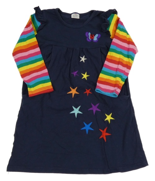 Tmavomodré šaty s hvězdičkami a motýlkem a volánky a barevnými pruhovanými rukávy