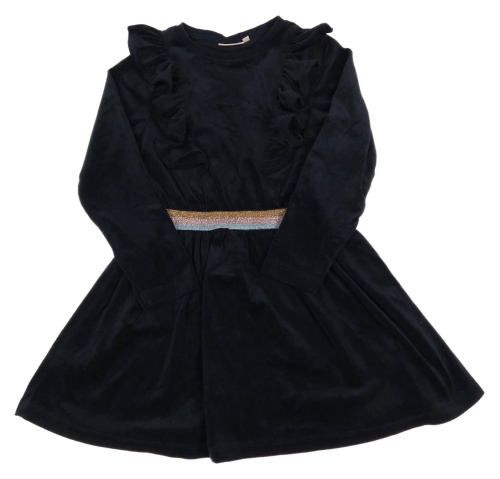 Tmavomodré sametové šaty s volánky a pruhovaným pasem Someone