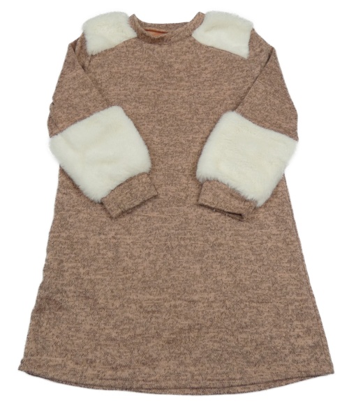 Pudrovo-hnědo-šedé melírované úpletové šaty s bílou kožešinou