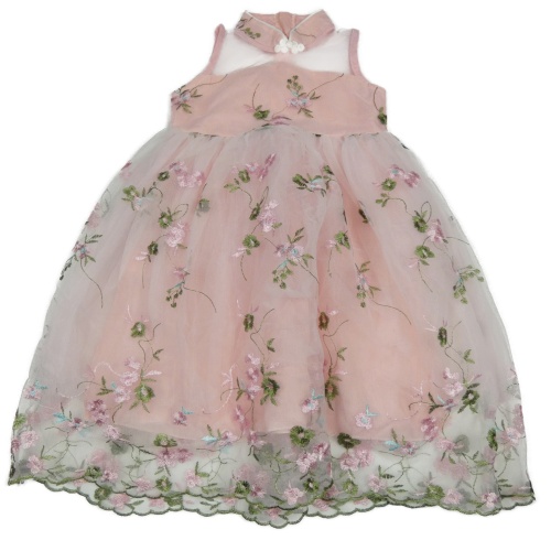 Světlerůžové tylové šaty se stojáčkem, výšivkou a květinami