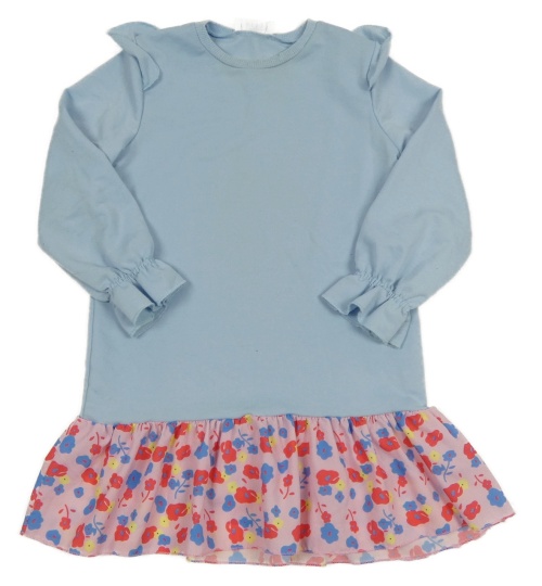 Světlemodro-růžové teplákové šaty s volánky a květovanou sukní