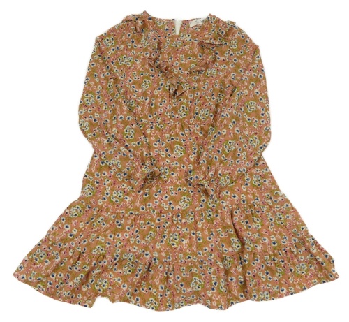 Skořicovo-zlaté pruhované šaty s kytičkami a volánkem