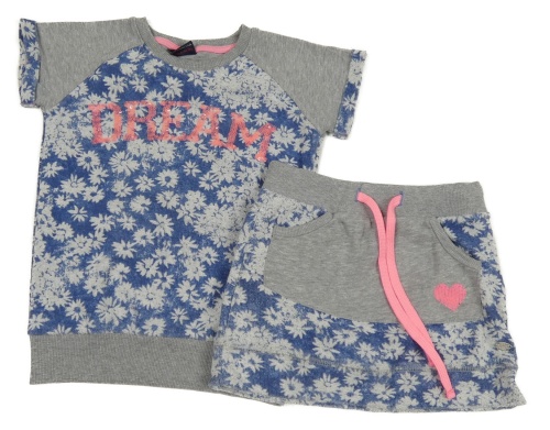2Set - Modro-šedo-bílá květovaná tepláková sukně se srdíčkem z flitrů + teplákové tričko s nápisem Tom-Du