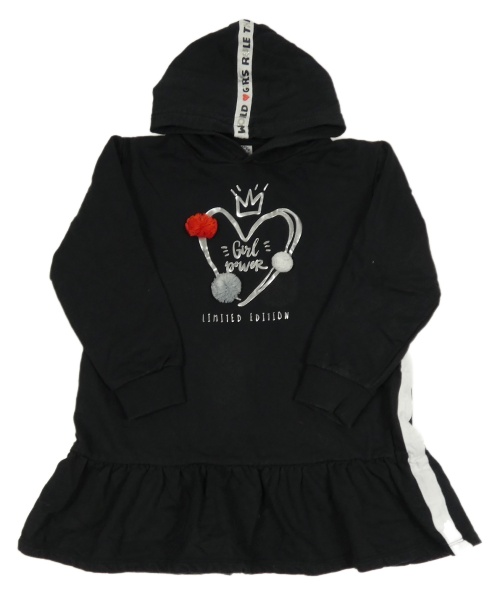 Černo-bílá tepláková šatová tunika se srdíčkem a bambulkami a nápisy a kapucí Charanga