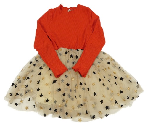Červeno-béžové žebrované šaty s tylovou sukní s hvězdami