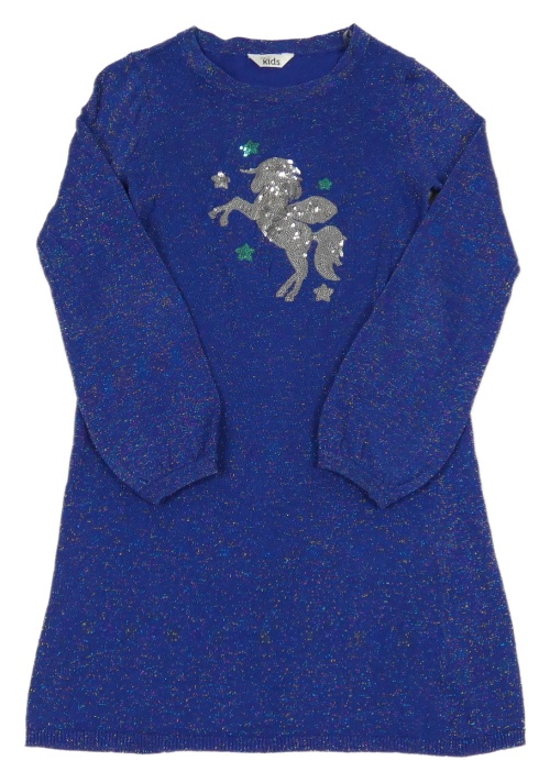 Tmavomodro-barevné úpletové třpytivé šaty s jednorožcem z flitrů M&Co.