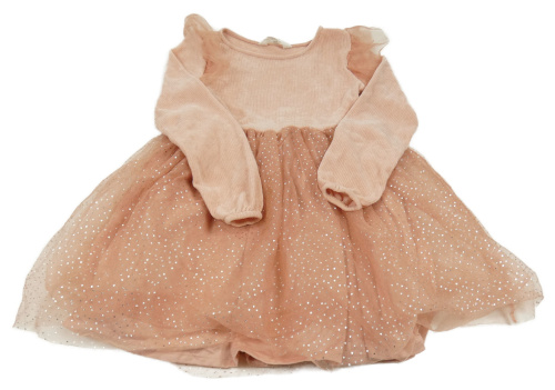 Broskvovo-starorůžové žinylkovo/tylové šaty s puntíky a volánky H&M