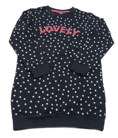 Tmavomodré puntíkaté teplákové šaty s nápisem