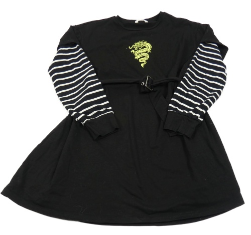 Černo-pruhované bavlněné šaty s drakem a páskem Shein