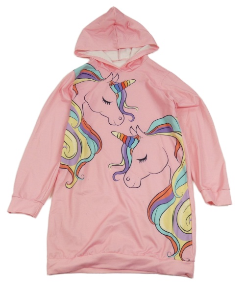 Světlerůžové teplákové šaty s jednorožci a kapucí