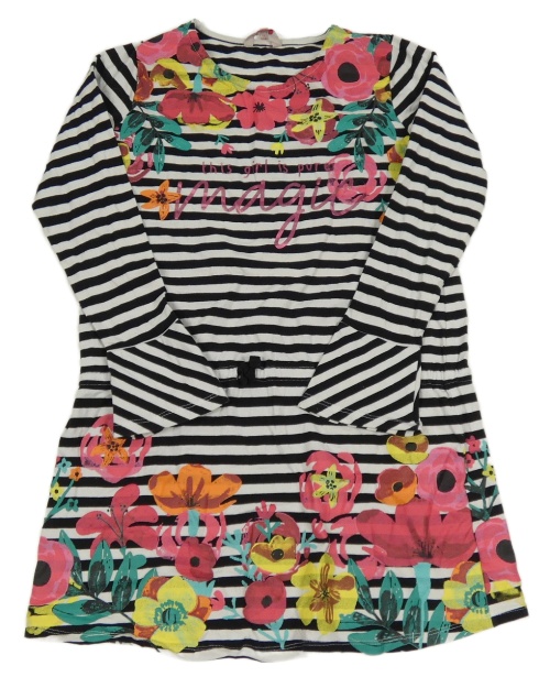 Černo-bílé pruhované šaty s nápisem a květy