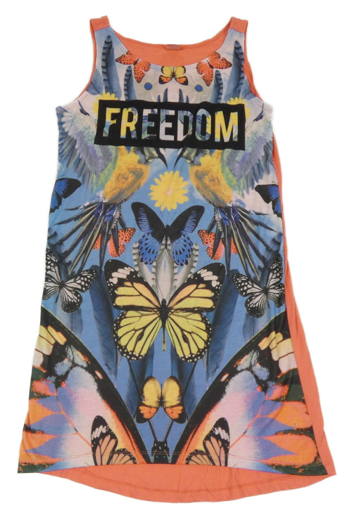 Oranžovo-barevné šaty s motýly a nápisem Y.F.K.
