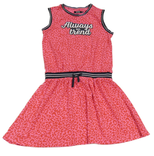 Růžové vzorované šaty s nápisem a pruhovanými lemy