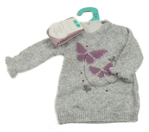 Nové - 2 set - šedé melírované svetrové šaty s motýlky + růžové punčocháče Primark