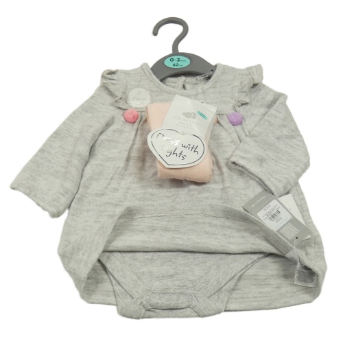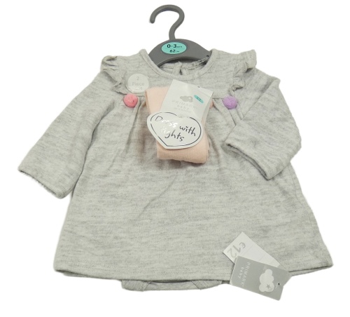 Nové - 2 set - šedé pletené šaty s všitým body a bambulkami + světlerůžové punčocháče Primark