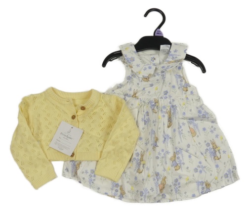 Nové - 2Set - Bílé plátěné šaty s králíčky + žluté perforované svetrové bolérko