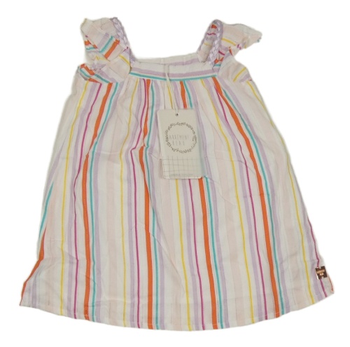 Nové - bílo-červeno-barevné pruhované plátěné šaty s volány
