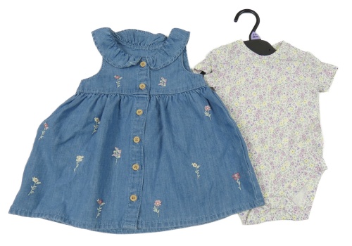 Nové - 2set - Modré riflové propínací šaty s výšivkami květin + smetanové květované body F&F
