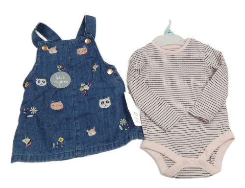 • Nové - 2set - Modré riflové laclové šaty s výšivkami zvířat a květů + růžovo-černé pruhované žebrované body F&F