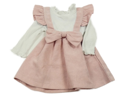 Bílo-růžové žebrované šaty s mašlí a volánky
