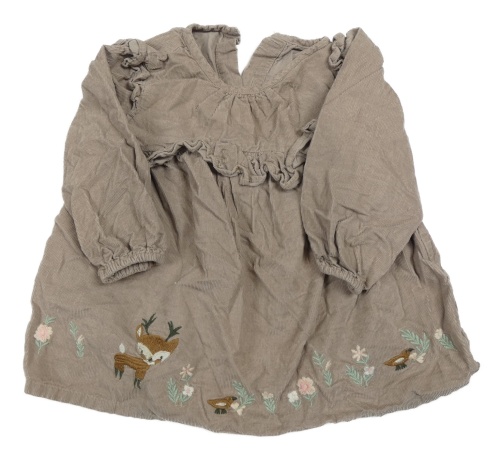 Světlehnědé manšestrové šaty se sobem a ptáčky a volánky Matalan