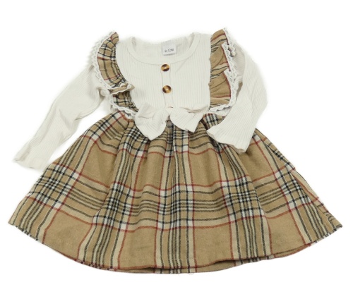 Bílo-hnědé šaty s kostkovanou sukní a volánky