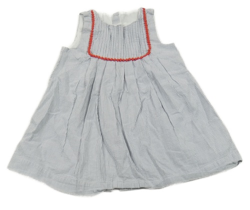 Světlemodro-bílé pruhované šaty s červenou ozdobou