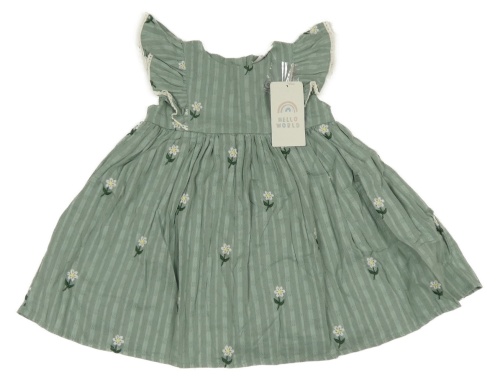 Nové - Zelenošedé pruhované plátěné šaty s kytičkami Hello World