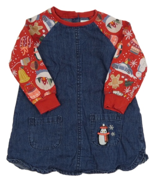 • Tmavomodré lehké riflové šaty s červenými teplákovými rukávy s vánočními obrázky Next