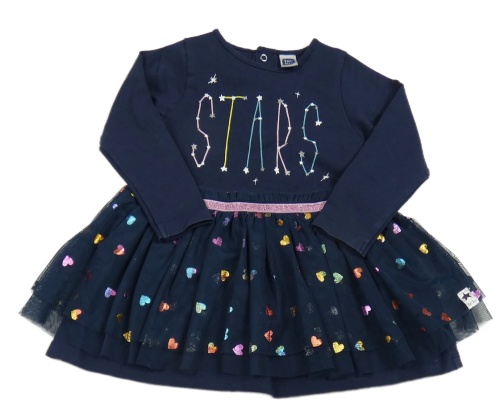 Tmavomodré šaty s nápisem a tylovou sukní s hvězdami