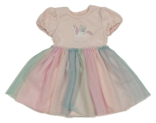 Světlerůžovo-pruhovaná teplákovo/tylové šaty s jednorožcem Nutmeg